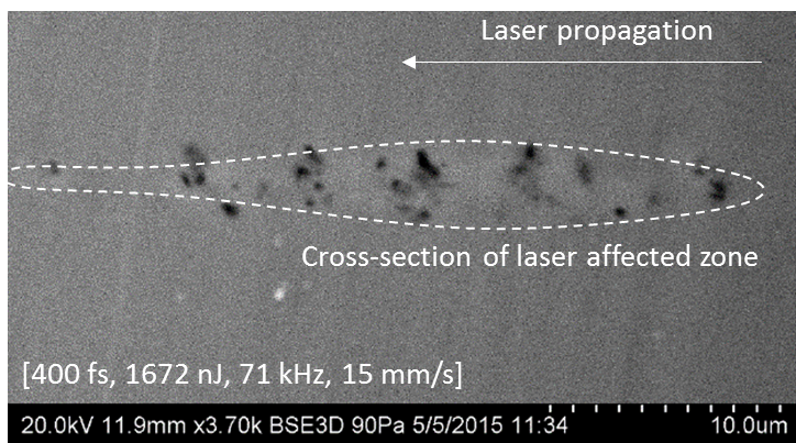 - The VP-SEM confirmed the existence of nano-porosity contained within the LAZ, and Raman spectra of the LAZs revealed an increase of less-membered rings in the silica network that was in favour of the enhanced FLICE etch rate as well as strong fluorescence as a proof of heat-induced defects. The findings added up to a conclusion that an enhancement of etch rate in the LAZs depended not only the chemical modification to the silica network but was also influenced by the heat induced by the laser irradiation.